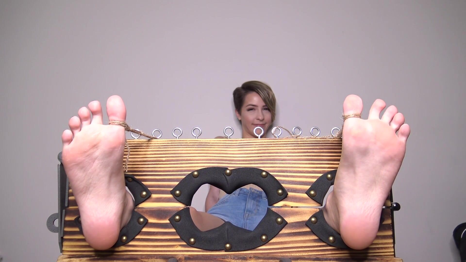 So here we Nick or as everyone in the foot fetish scene knows her as Pink Soles! She is a 25 year old baddie with a LARGE instagram following of foot fetish lover but….shes never been TICKLED. So its time for her and her SEXY size 6 feet to get the treatment. Now Nick is not over the moon ticklish and admits that early but, its time to find those giggles. I start with her interview in the stocks before I start by removing her sneakers and revealing her socked feet (she does a SEXY toe wiggle in the socks) and then the socks come off. I lightly tickle her feet and is GRINNING ear to ear telling me to go lighter. Then I get her left foot and BOOM I get the foot jerk and a giggle as she begins to focus on my fingers getting used to the feeling but you all know we cannot stop there! Then its toe tie and tool time. I break out some solid lotion and I start getting a louder more pushed laugh as Nick cannot hold it in anymore. But its not going to stop there as I break out the tools and she is unable to stop smiling before BURSTING into laughter. Check out the first part of the sexy Pink Soles getting tickle tormented!