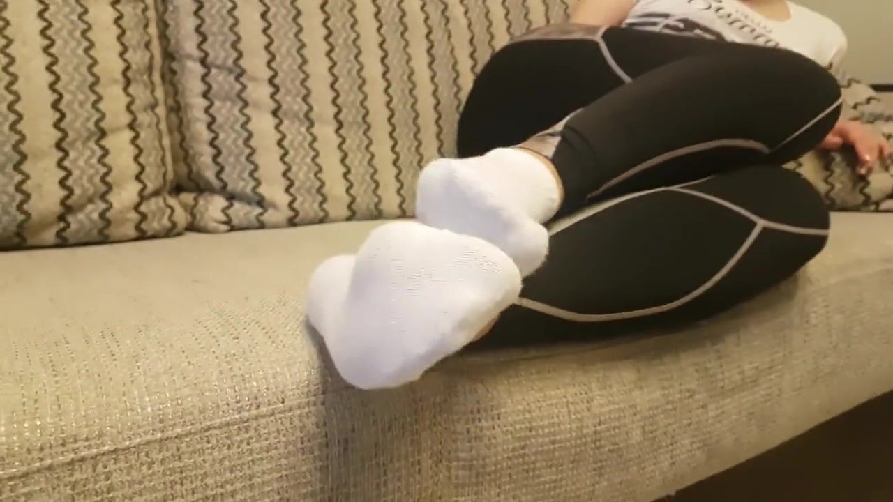 AFTER GYM SWEATY FEET IN WHITE ANKLE SOCK AND TAN NYLON PANTYHOSE
