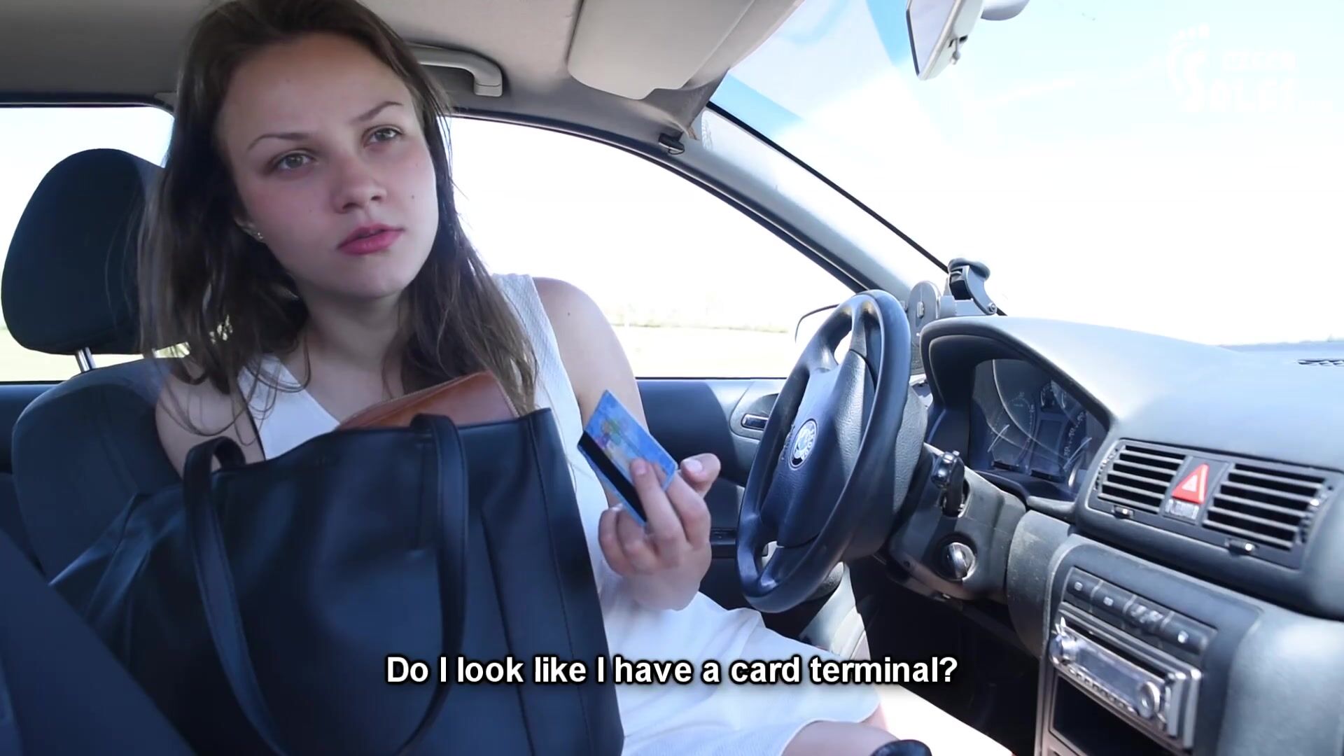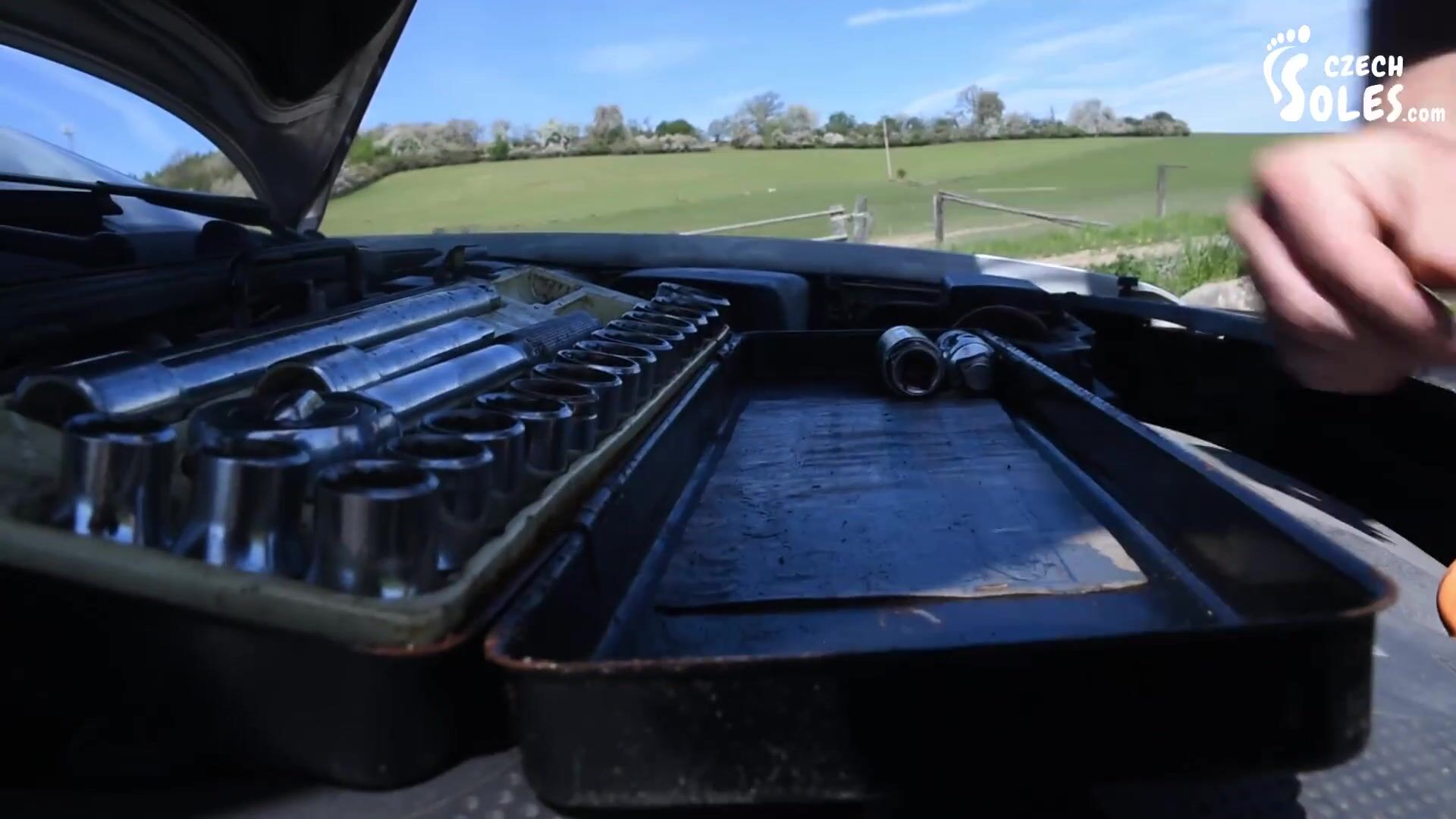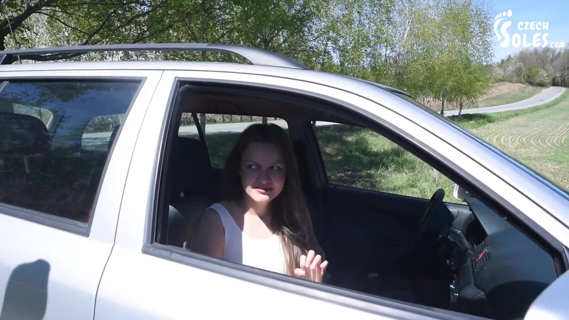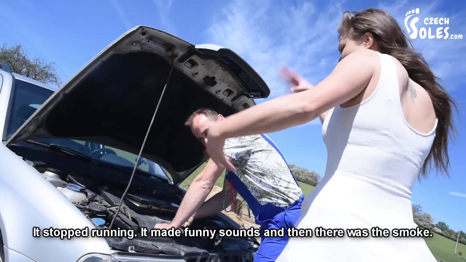 Megan's car is in the shop and she has renter on from her poor friend. She's used to BMW and not this bucket, but it's better then to use public transportation. That's only filthy and disgusting and Megan would never take it. She's bit of a city barbie and she won't use anything else then a car of her own. But this barbie has a problem right now. The rented car stopped running and she's in the middle of nowhere. In the fields somewhere and she of course doesn't know a thing about engines and cars. What to do now? She tries to find some closest local car shop and have them someone over immediately. Too little she knows about the village folk...there is no shop. There's just a guy with a hammer or something. Some redneck who can fix the car only with sheer force of luck. Oh my god and here he goes...what a jerk just on a first look. But Megan is facing her car and he's coming behind her, measuring her up with his look and getting totally turned on by her sexy pink high heels and amazing ass and dress. When he arrives and clears his throat Megan gets a little bit spooked. "Who the hell is this redneck??" she thinks. But she don't have any other option then to trust him. He says he can fix it so let's see. Megan is waiting in the car with her feet out of the window and the guy is all the time checking out her feet and heels...what a piggy this guy. But he actually manages to fix the car. Amazing! Megan thanks him so much and she takes her credit card to pay him for his service. But he just laughs at her card with the question "And where should I put the card, madam?". He only takes cash, no internet or anything here...but Megan has no cash. They will have to figure out a different form of payment. "Listen madam, those high heels and sexy feet of yours...let me worship them and I'll consider us even. Deal?". His dreams and Megan's worst nightmare is going to be a reality now...