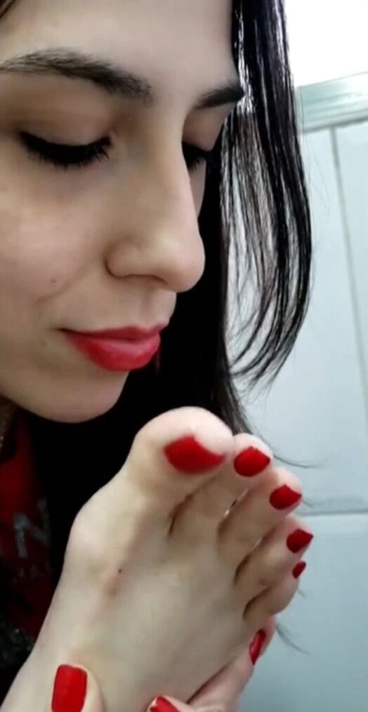 Brazilian teen with red toenails self worship her feet